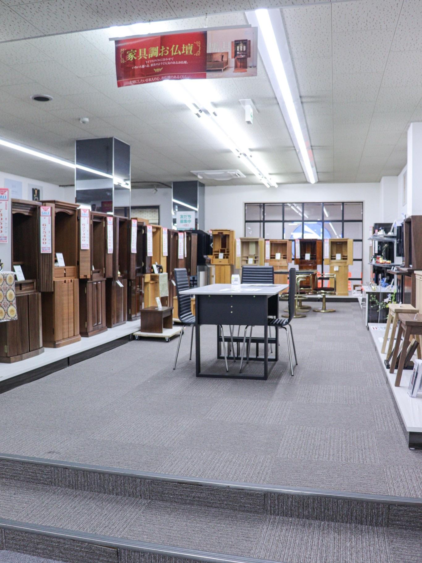 二階・三階フロアには、人気の高い唐木お仏壇から、近年人気が高まっている家具調のお仏壇コーナーもございます。